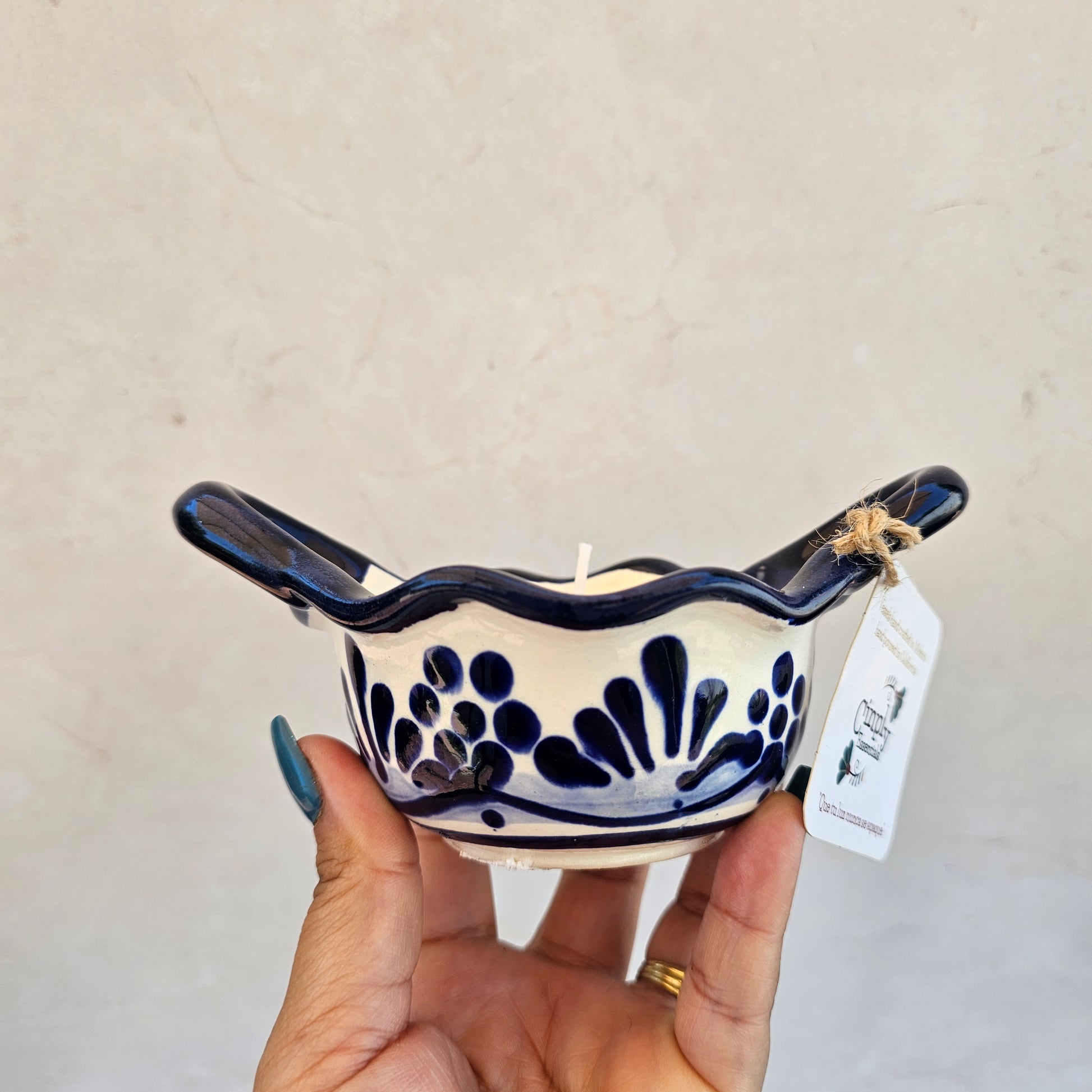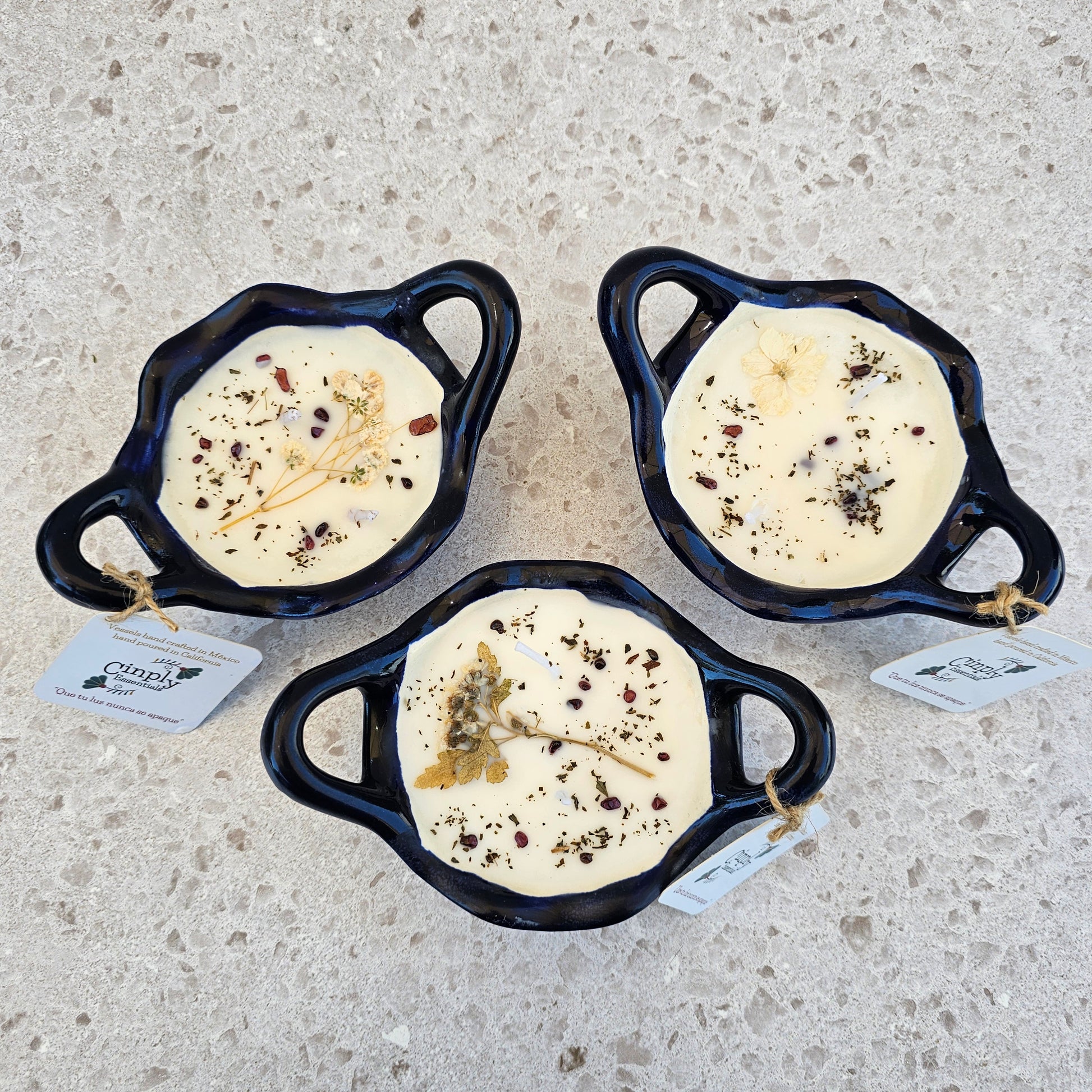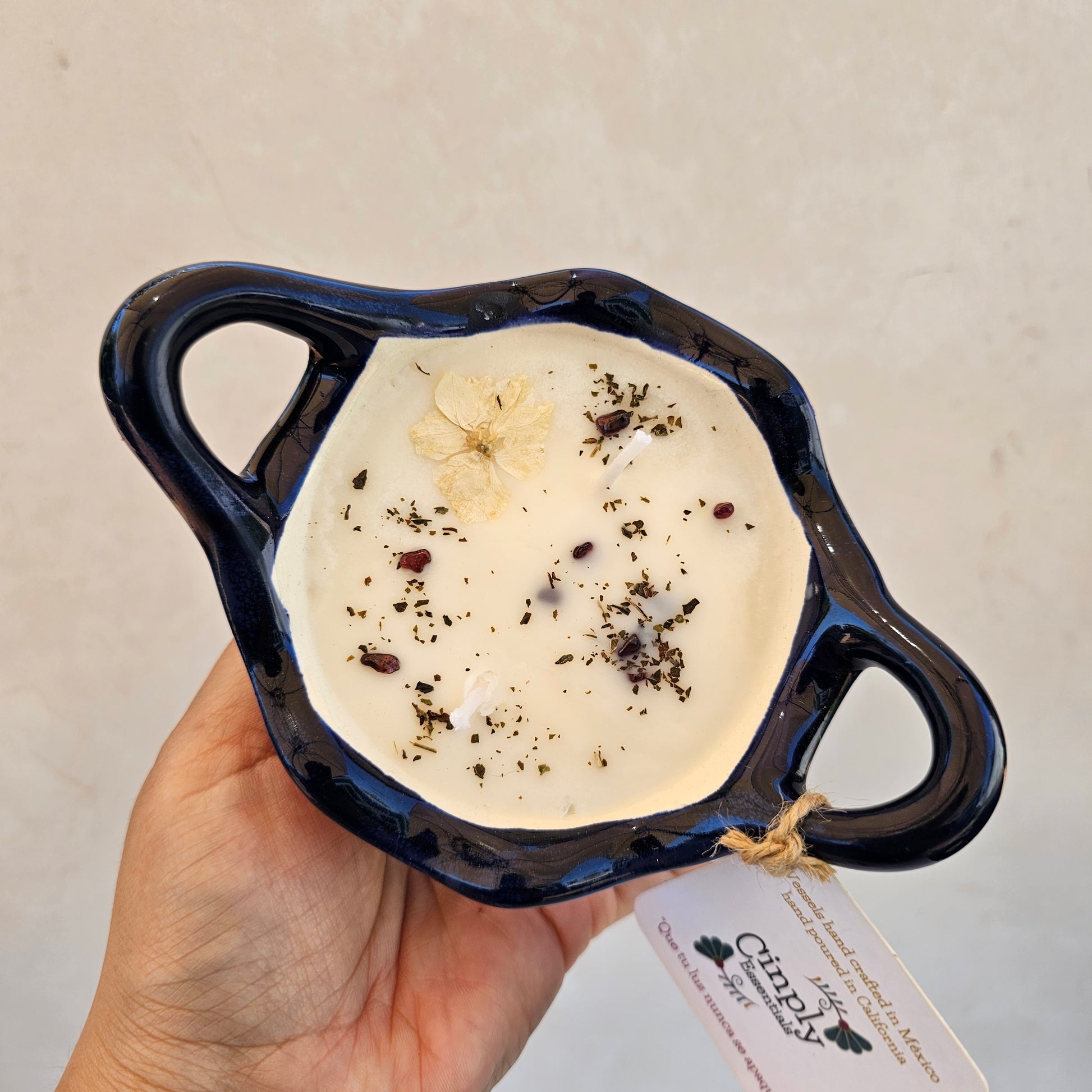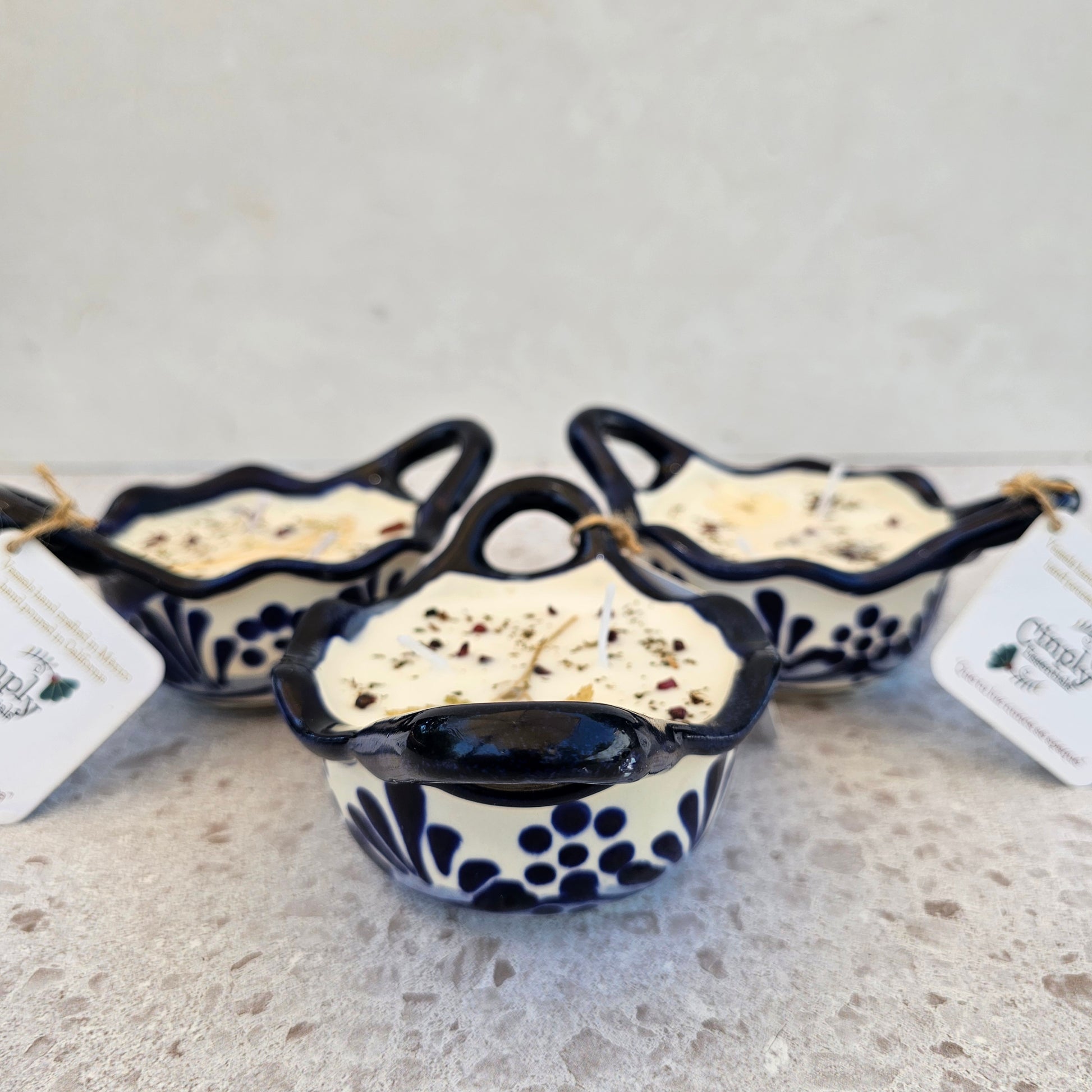 7 oz | HempSoy Wax | cotton wick | Topped w/ crystals & dried plants | vessel food safe & reusable | cazuela made in Mexico | eco friendly- non toxic | burn time approx 20-30 hours