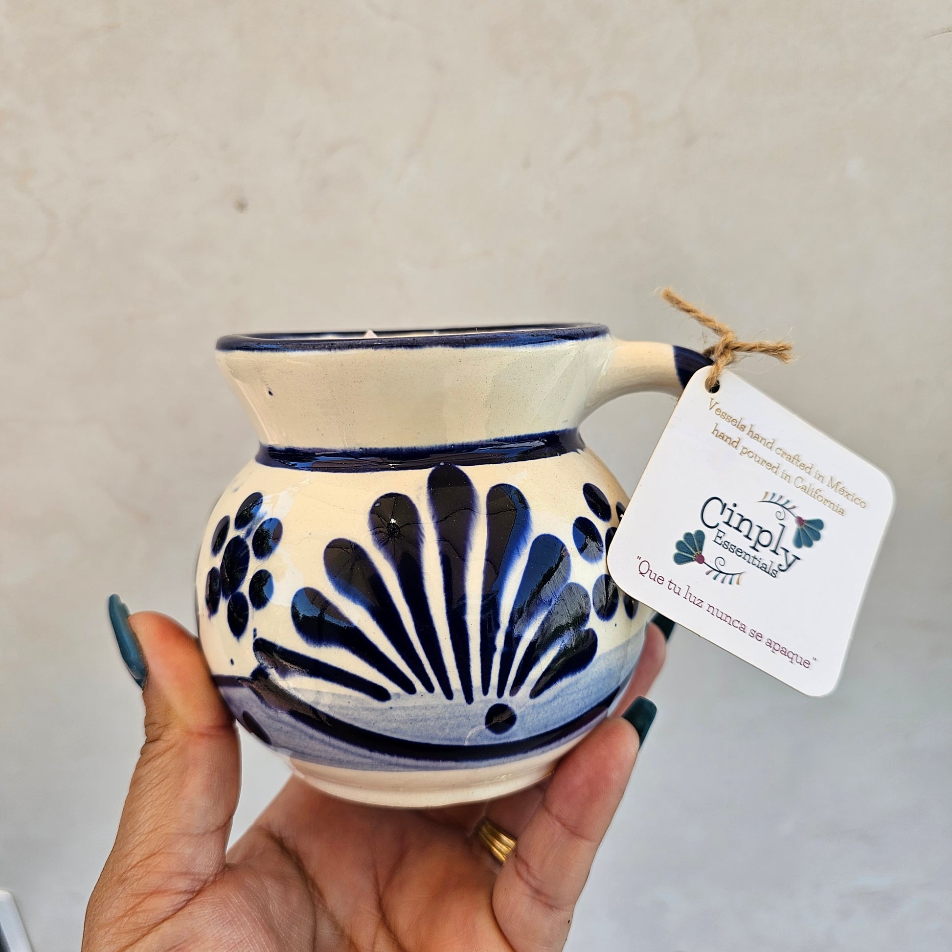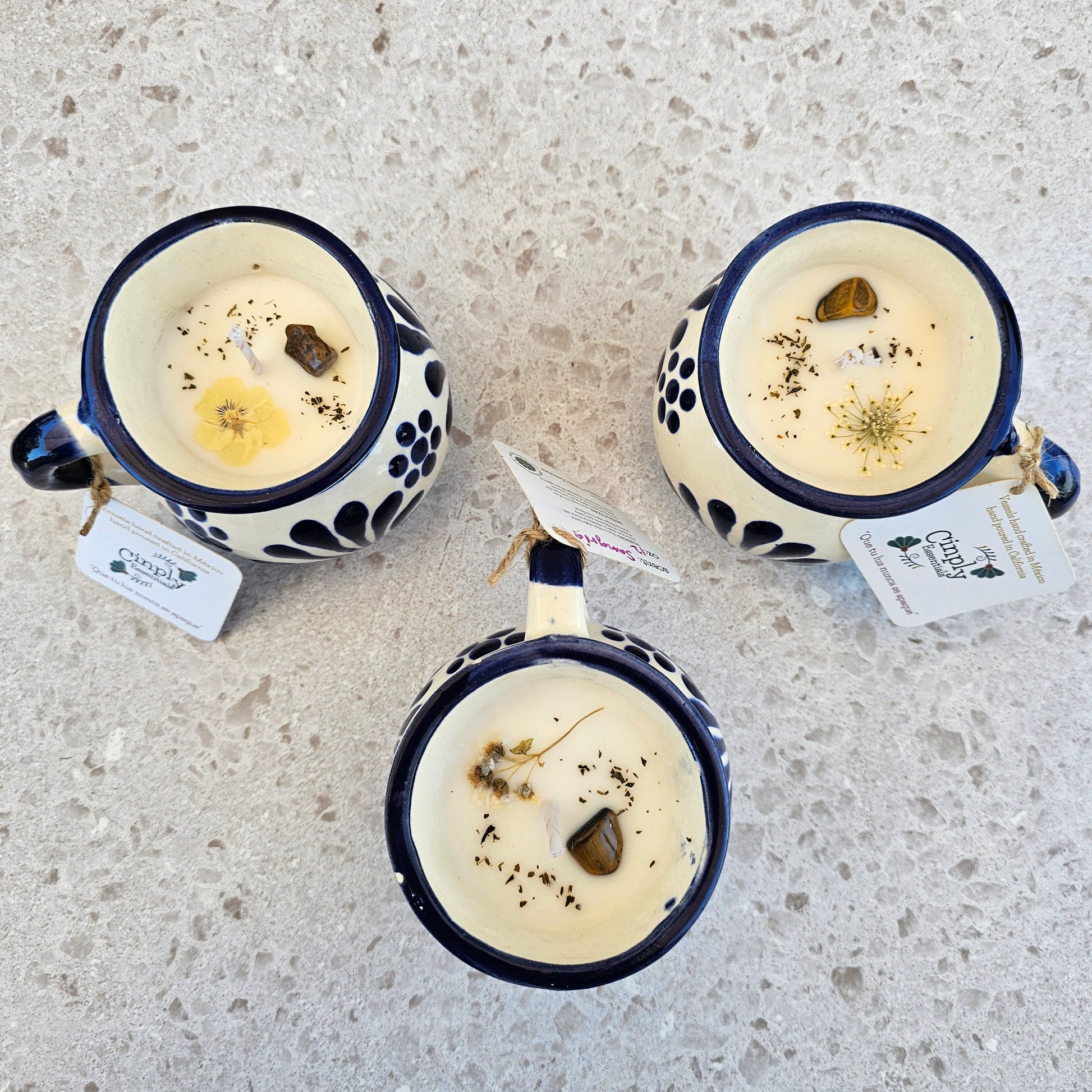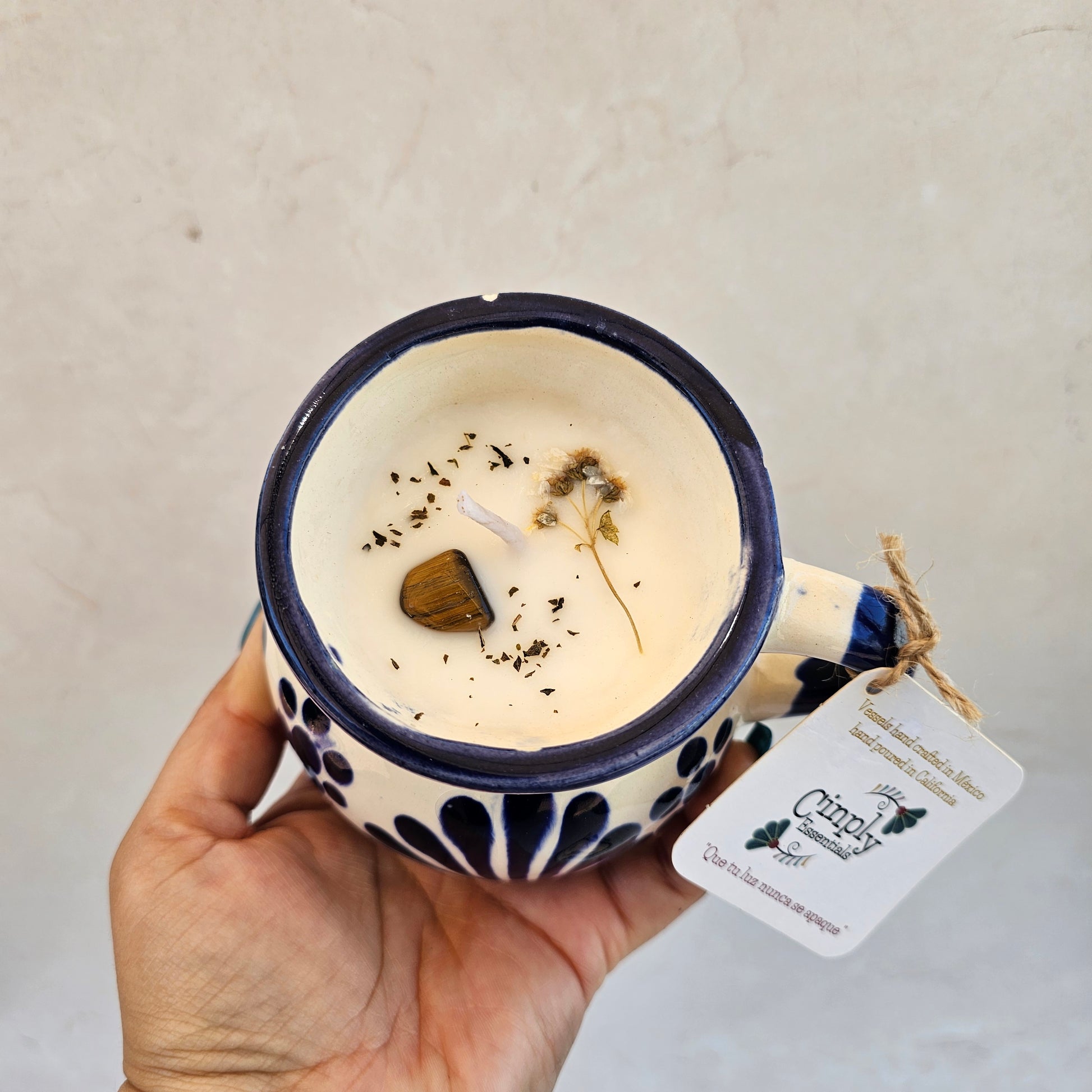 12 oz | HempSoy Wax | cotton wick | Topped w/ crystals & dried plants | vessel food safe & reusable | cazuela made in Mexico | eco friendly- non toxic | burn time approx 40-50 hours