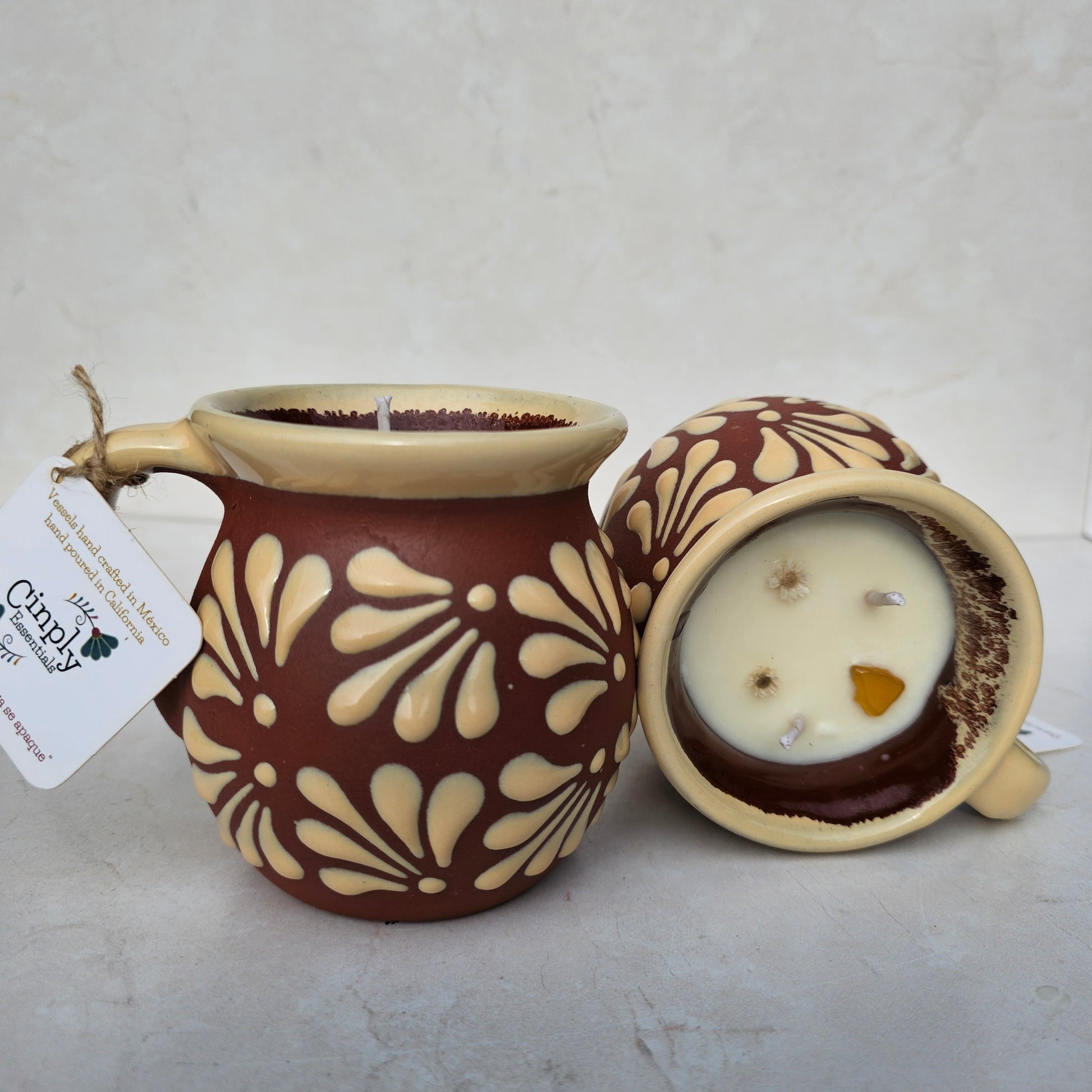 Elegant, earthy, and full of heart — this candle is poured into a brown and nude Talavera-style clay mug inspired by warm, grounded tones found in nature. Each vessel is handcrafted, making every piece a unique and functional keepsake. After the candle burns down, the mug can be reused for coffee, plants, pens, or décor — a lasting tribute of love.