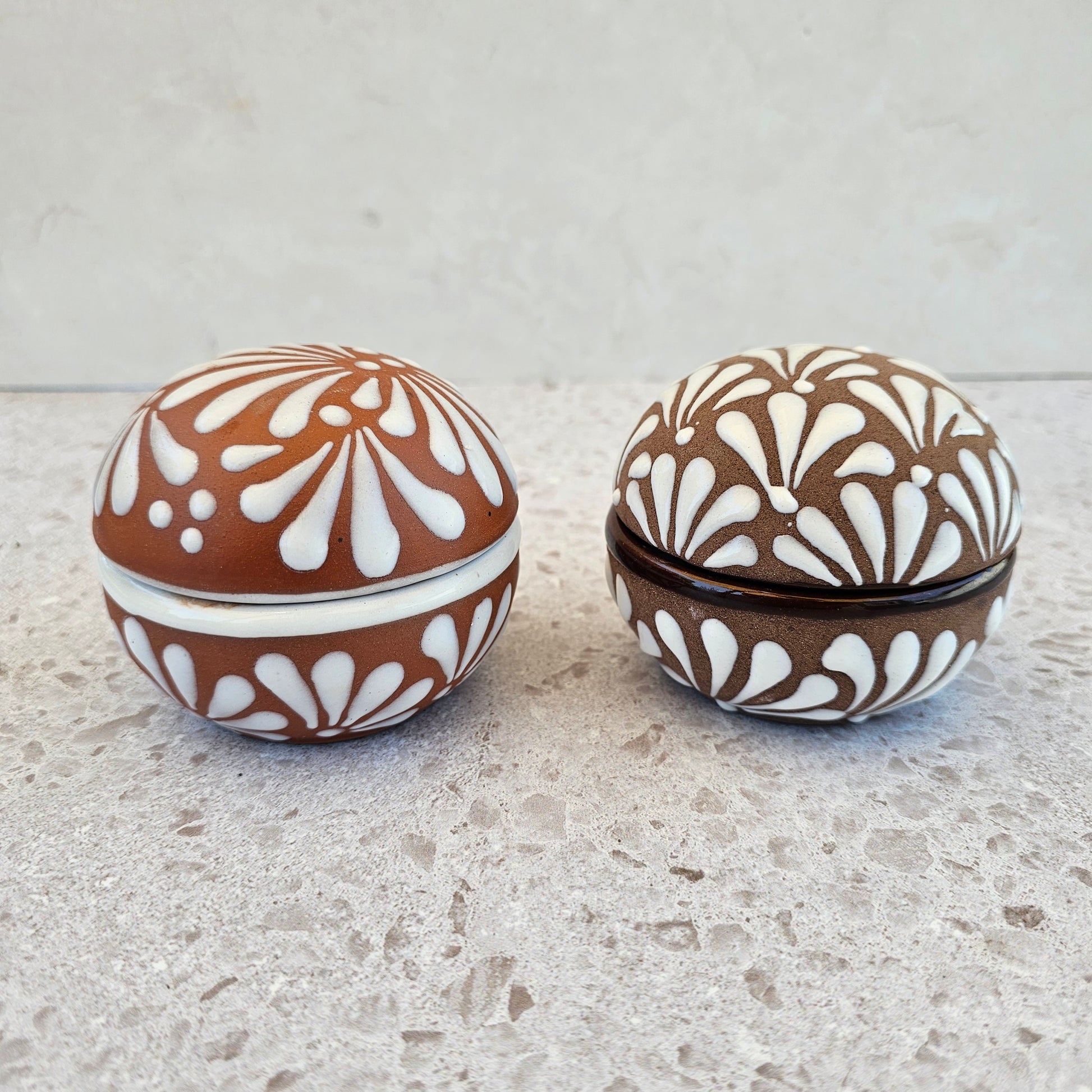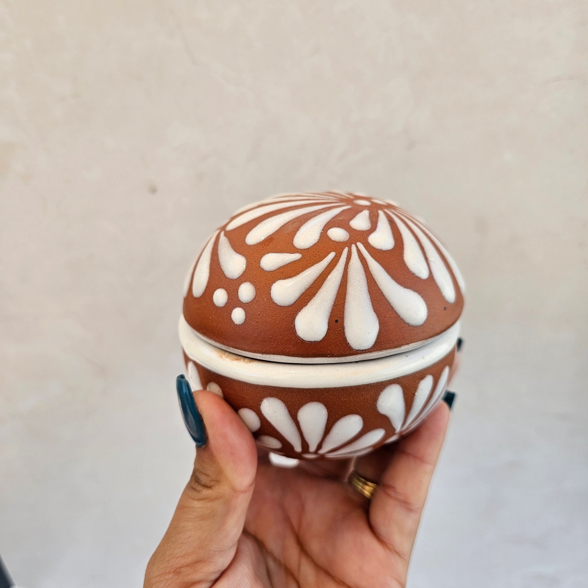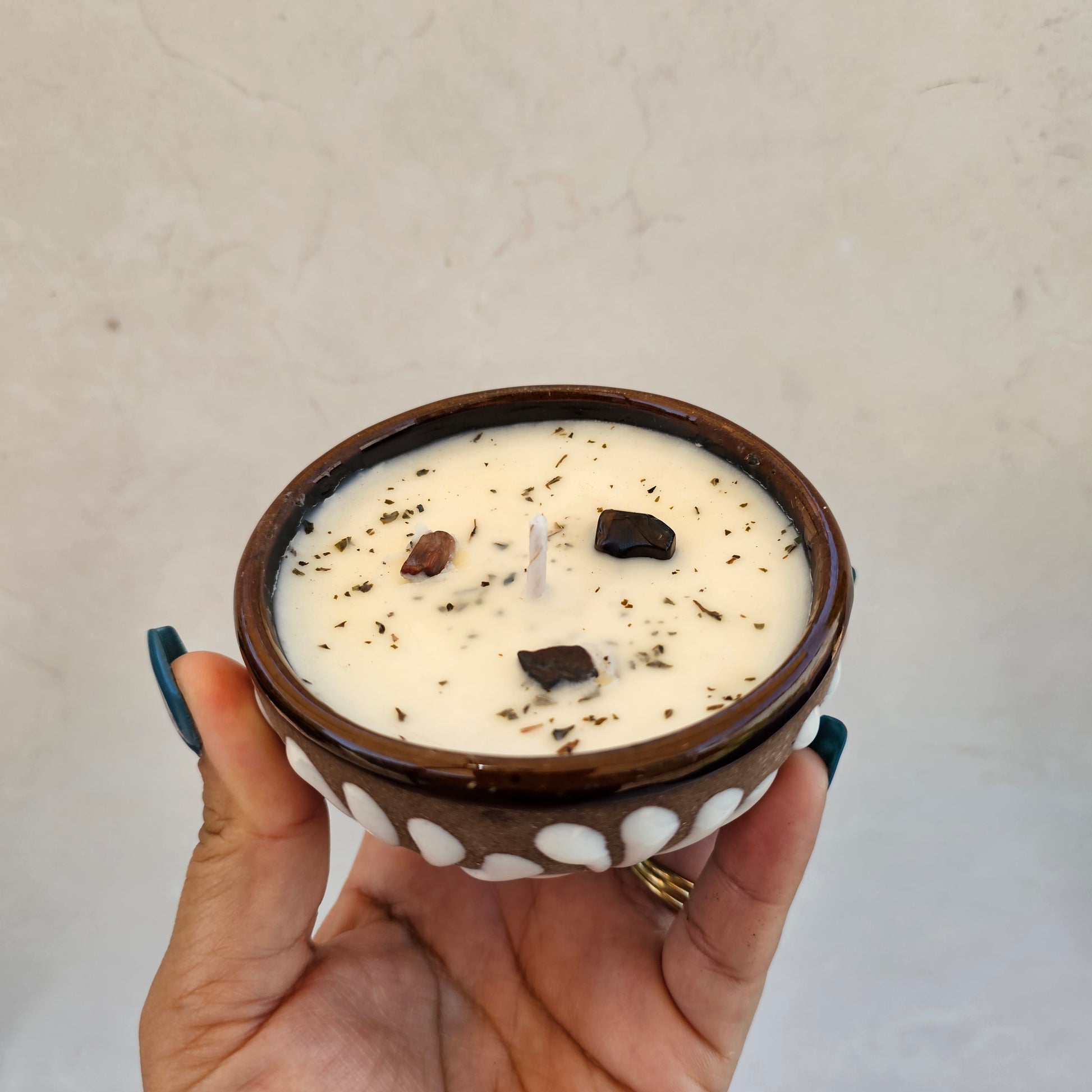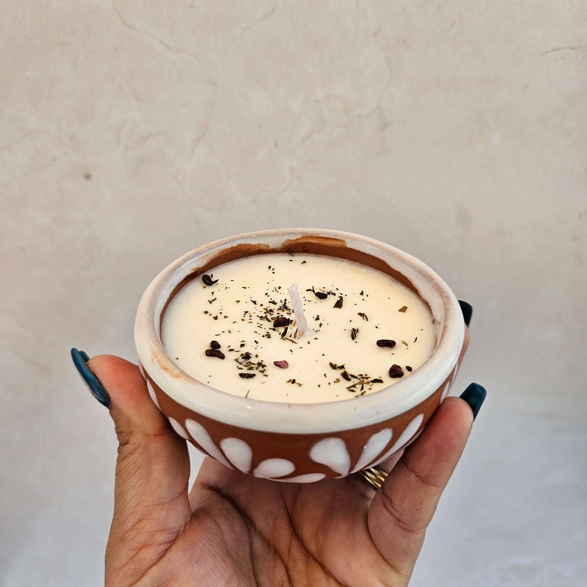 3.5 oz | HempSoy Wax | cotton wick | Topped w/ crystals & dried plants | vessel food safe & reusable | cazuela made in Mexico | eco friendly- non toxic | burn time approx 15 hours