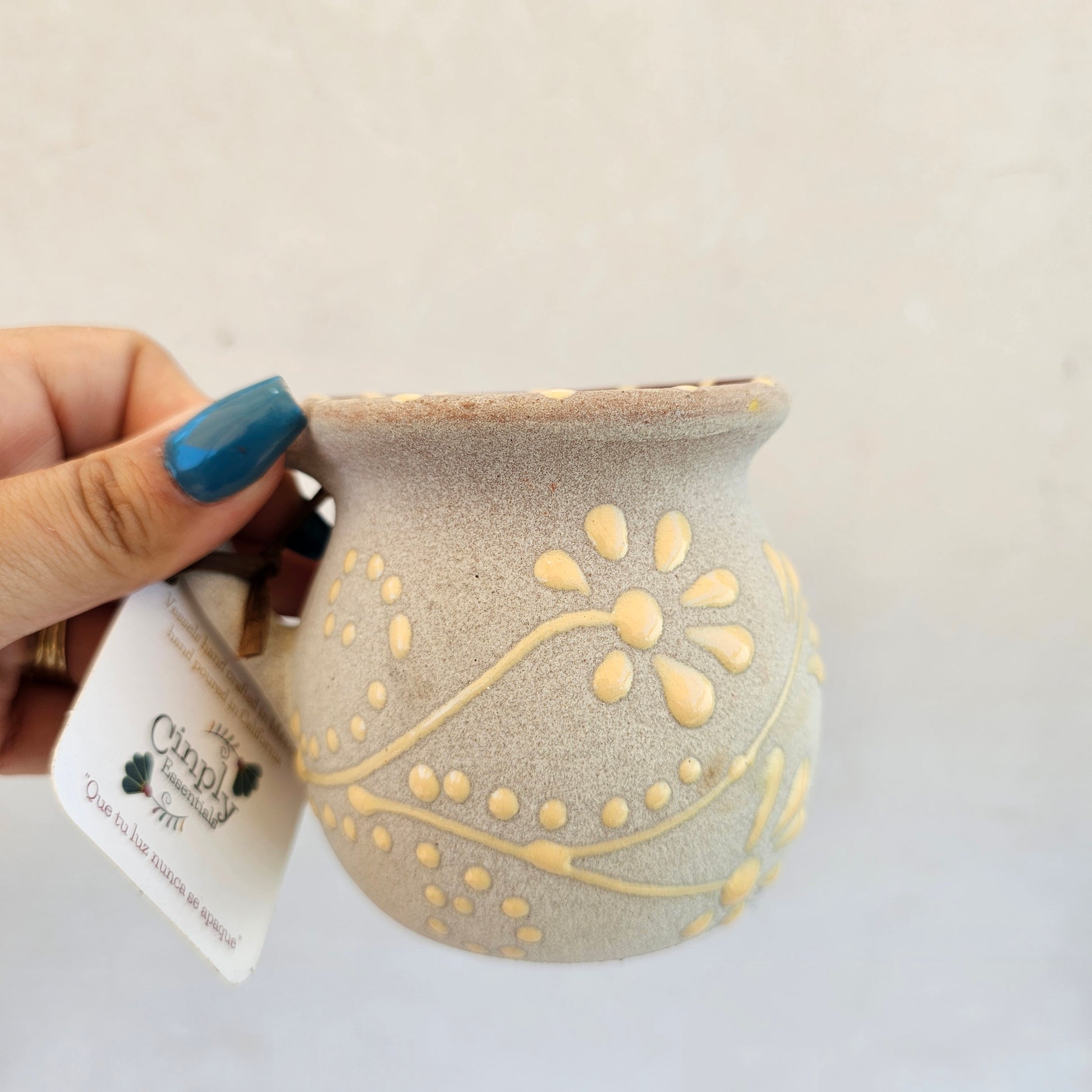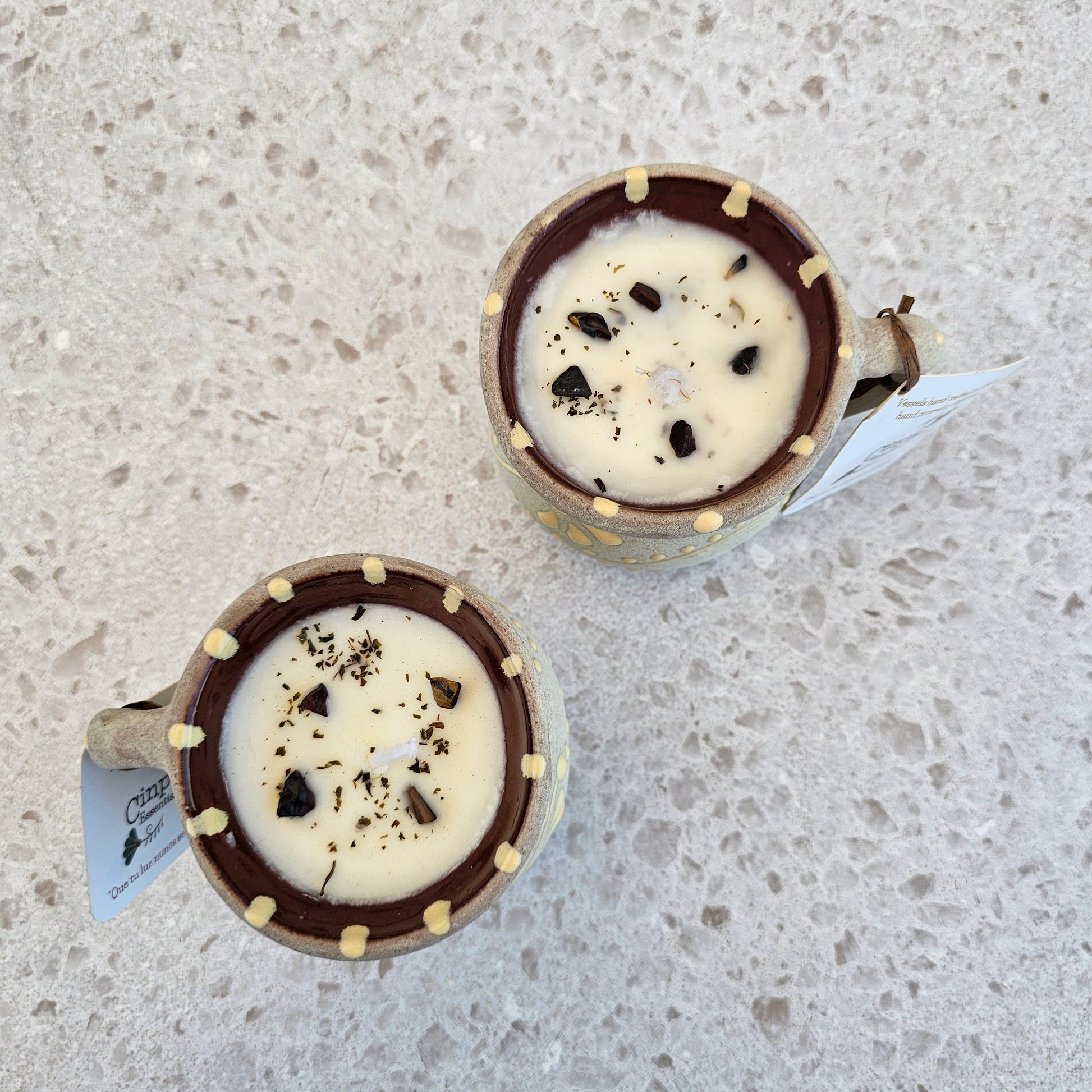 7 oz | HempSoy Wax | cotton wick | Topped w/ crystals & dried plants | vessel food safe & reusable | cazuela made in Mexico | eco friendly- non toxic | burn time approx 20-30 hours