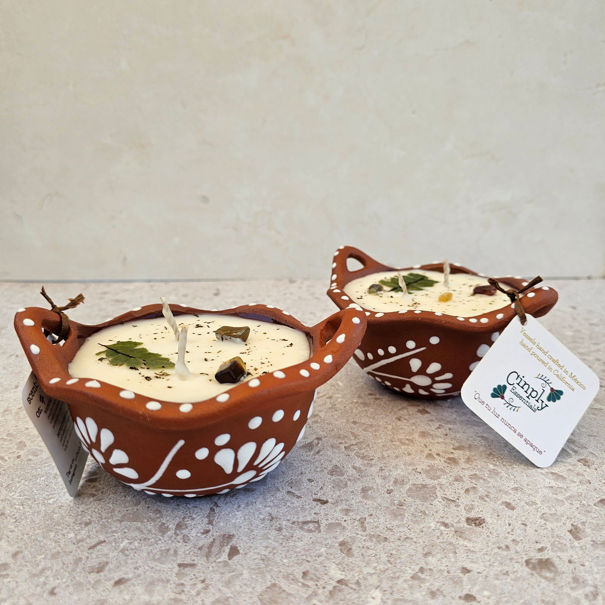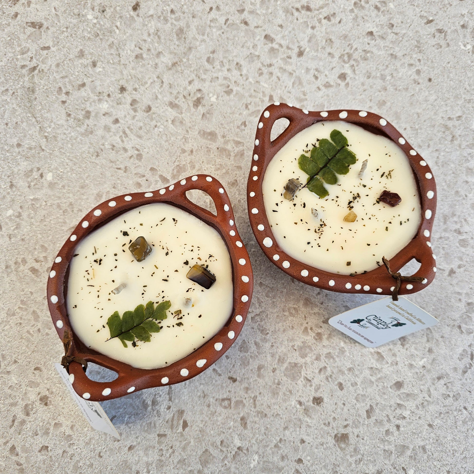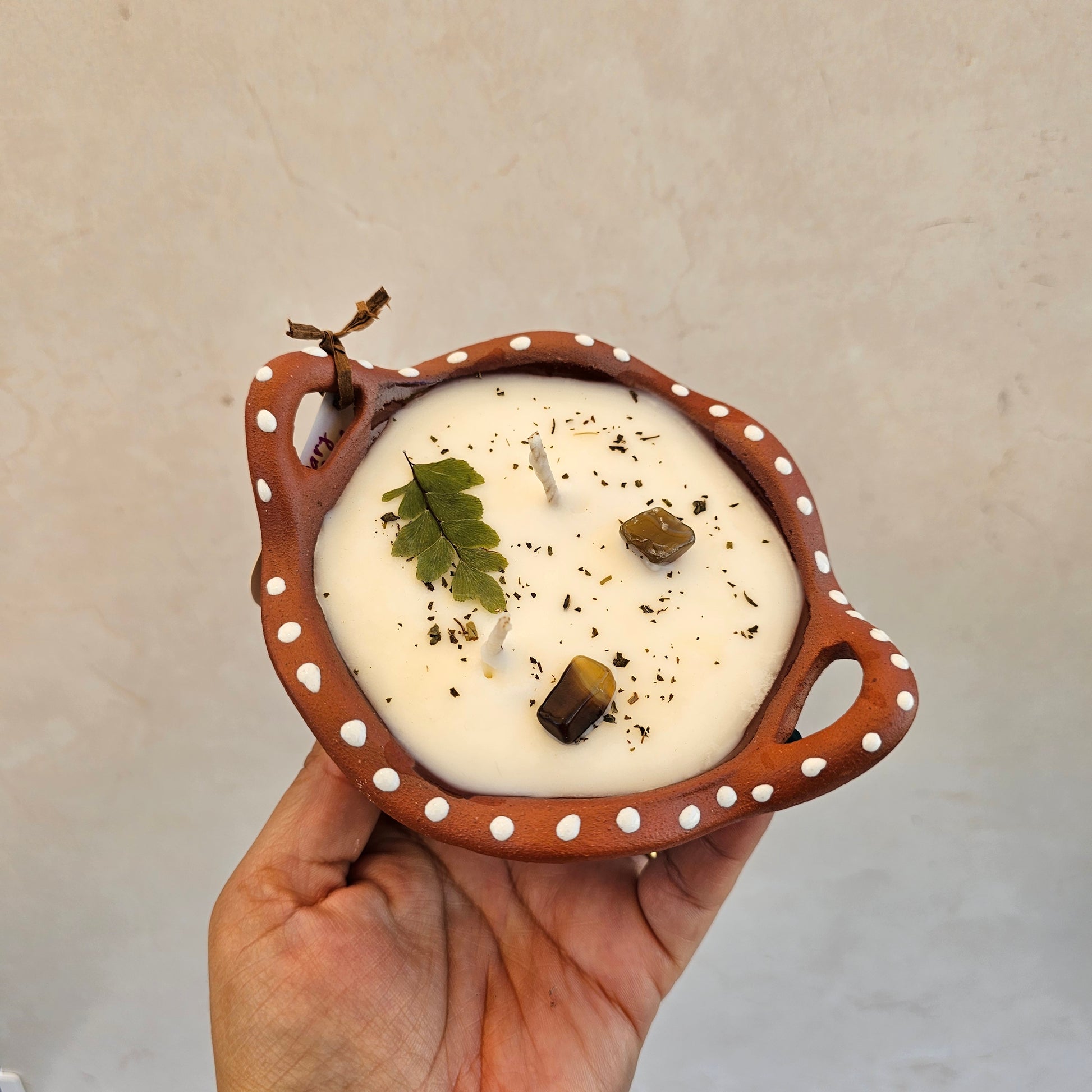 7 oz | HempSoy Wax | cotton wick | Topped w/ crystals & dried plants | vessel food safe & reusable | cazuela made in Mexico | eco friendly- non toxic | burn time approx 20-30 hours